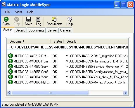 The WirelessDMS MobileSync Server takes the documents you synchronize and communicates with your DM Server to put the synchronized files back in the library. It updates document history and maintains a list of who has which documents synched to which devices.